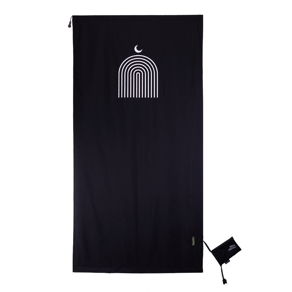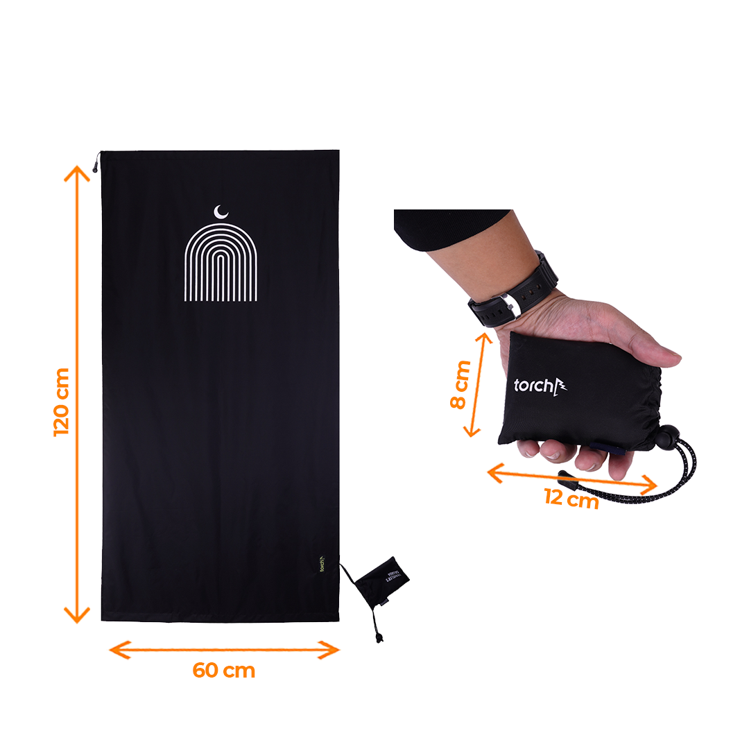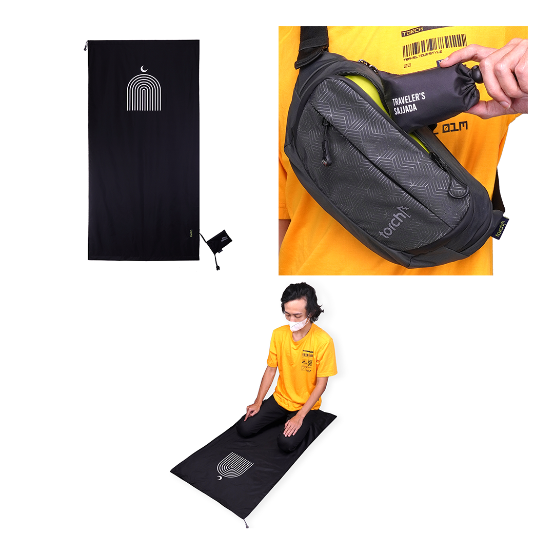 Sajjada tipis dan minimalis yang bisa dilipat menjadi pouch kecil muat dalam travel pouch atau waist bag.