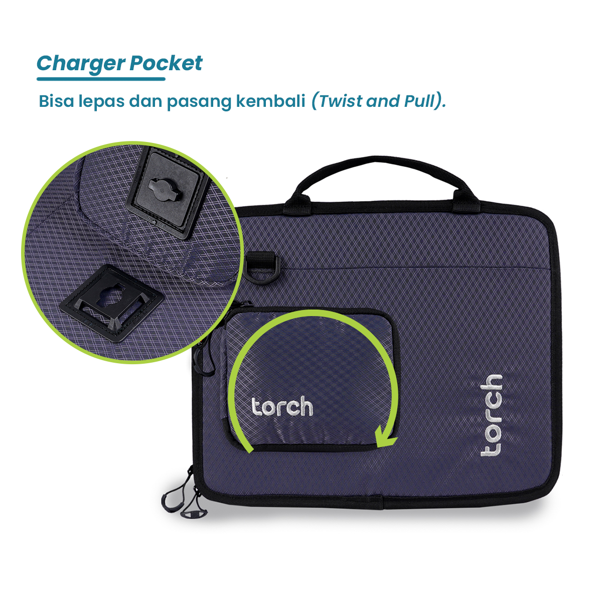 Saku bagian depan bisa kamu twist saat hanya ingin jadi laptop case biasa untuk simpan dalam backpack dan pasang kembali saat ingin menjadi laptop sling. Â