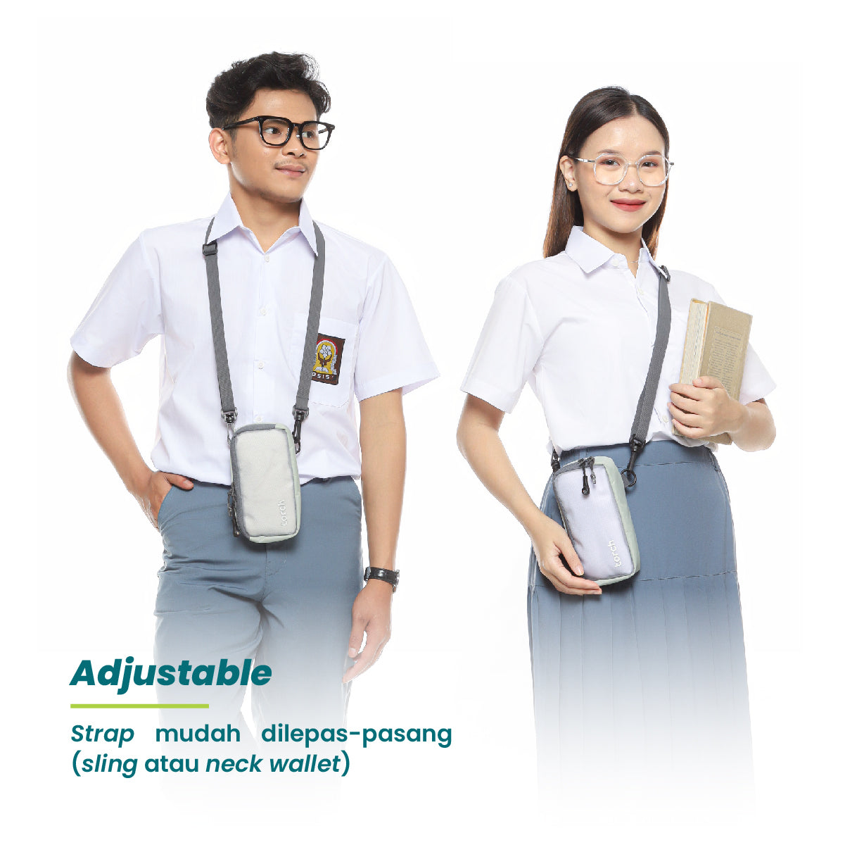 Pasang strapnya, lalu jadikan dompet selempang atau gantungkan di leher.