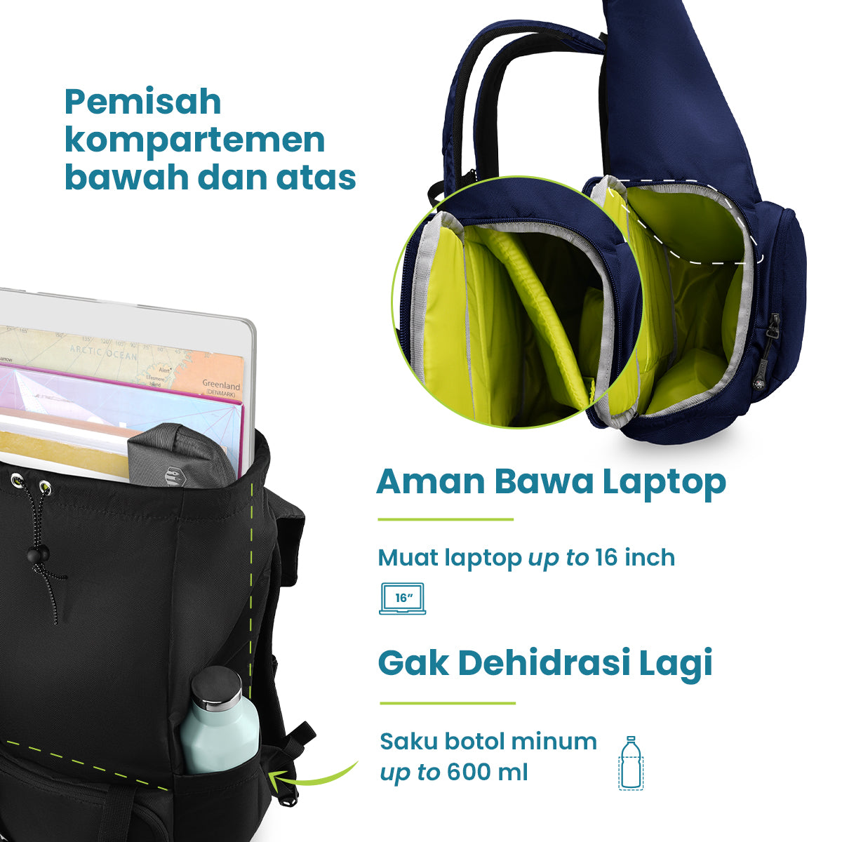 Aktivitasmu membutuhkan laptop? Aman, laptop hingga ukuran up to 16 inch masih muat ke dalam kompartemen laptop dalam tas ini.