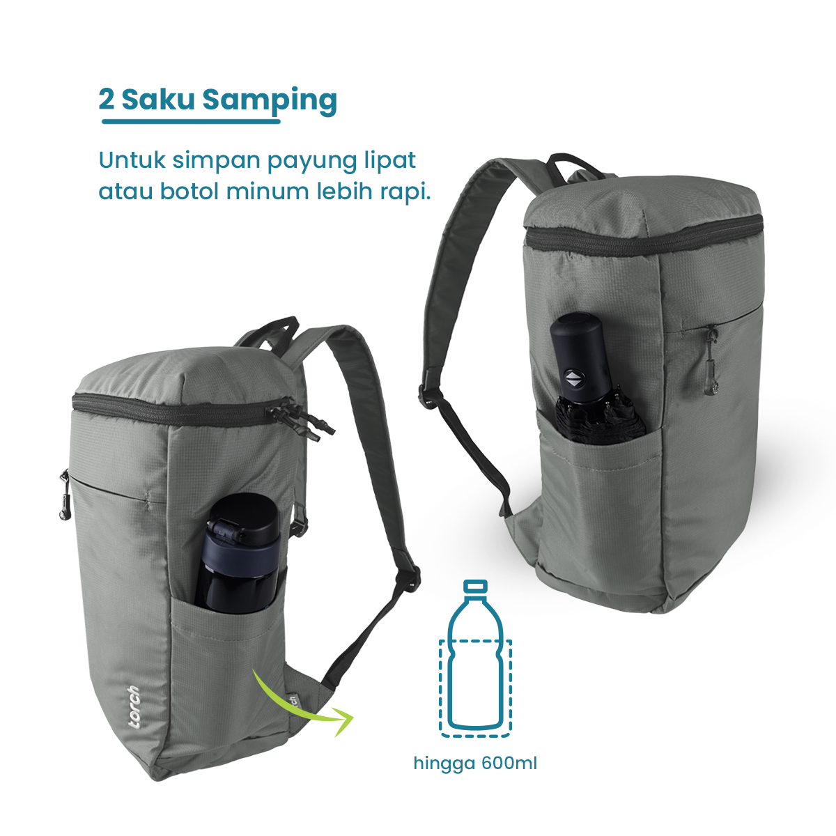 Ada 2 saku samping yang dilengkapi dengan webbing, bisa kamu manfaatkan untuk menyimpan payung lipat atau botol minum.