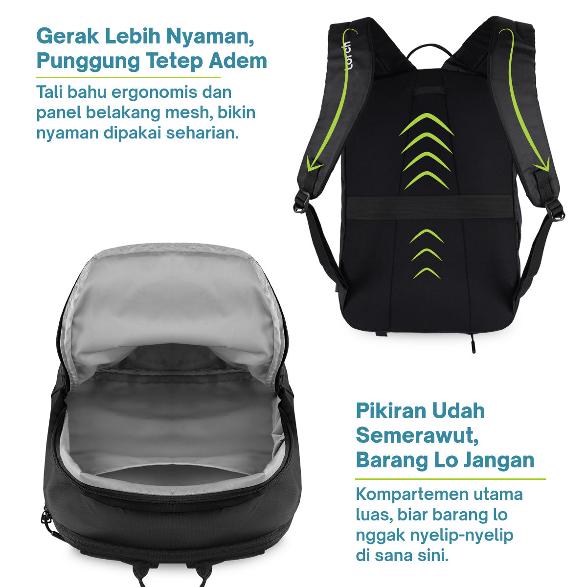 Semua yang lo butuhin muat di kompartemen utama dengan kapasitas 21 liter, sementara laptop tetap aman di kompartemen terpisah dengan Shock Suspension Laptop Protection biar lebih aman dari benturan.