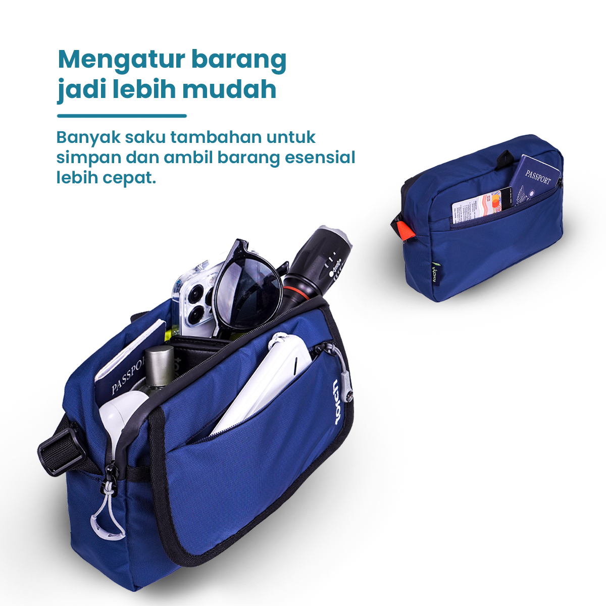 Meskipun tertutupi oleh velcro, tapi bagian saku depan bisa memuat banyak barang-barang yang kamu perlukan seperti tissue pack, kunci kendaraan, ataupun sticky notes.