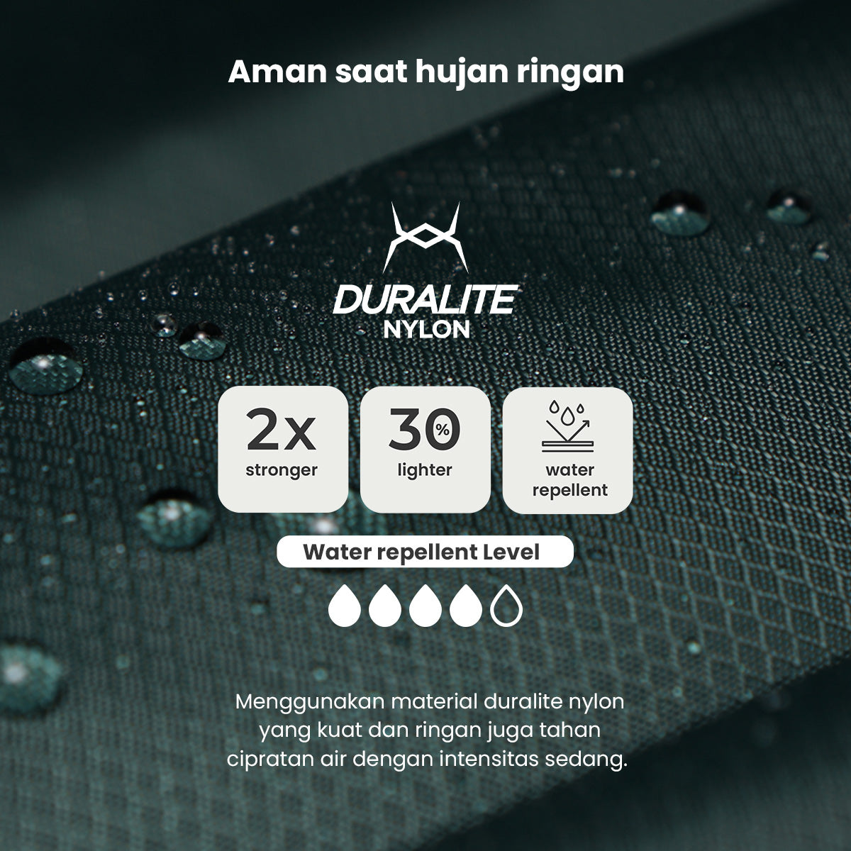 Terbuat dari bahan Duralite Nylon yang teruji water repellent, aman dari percikan air.