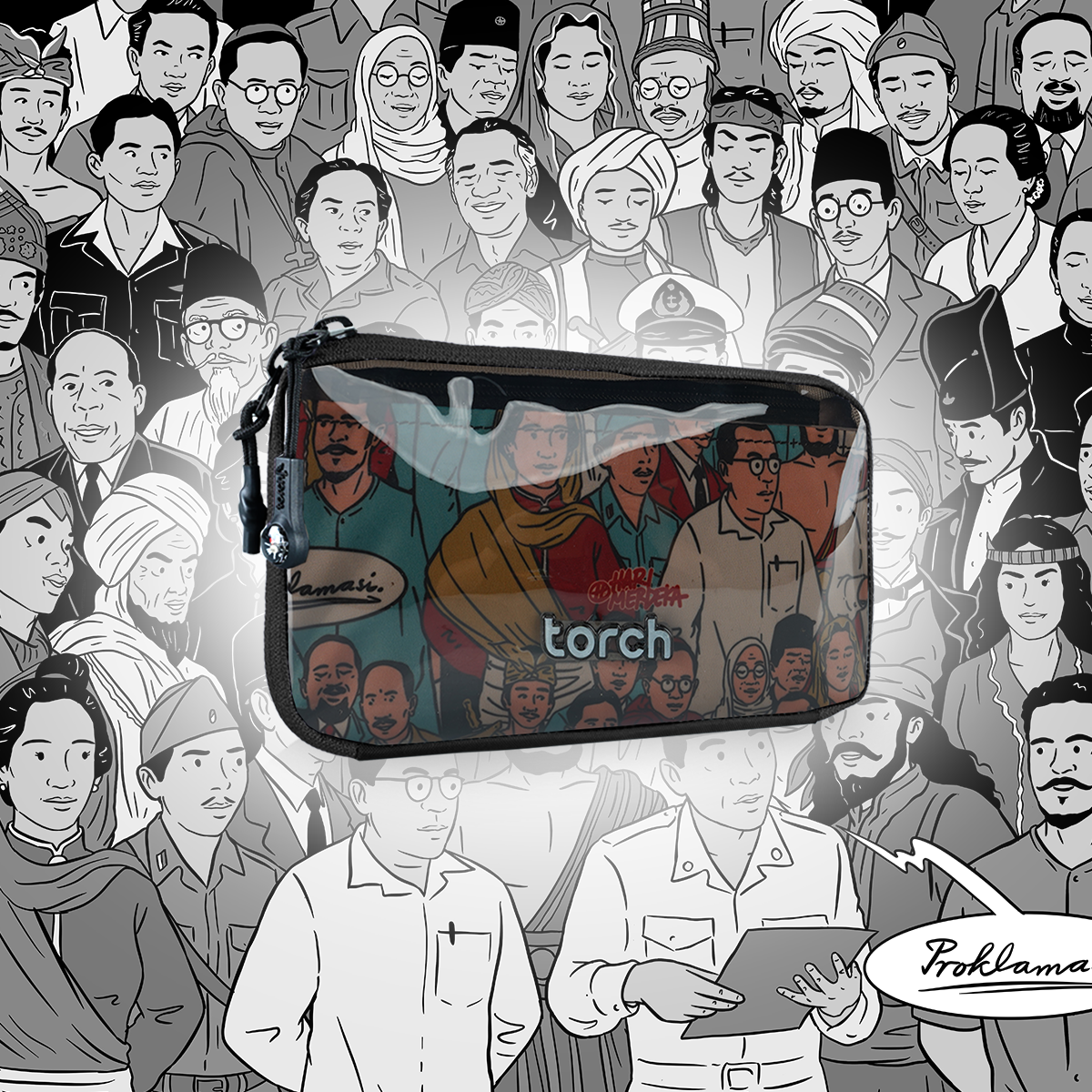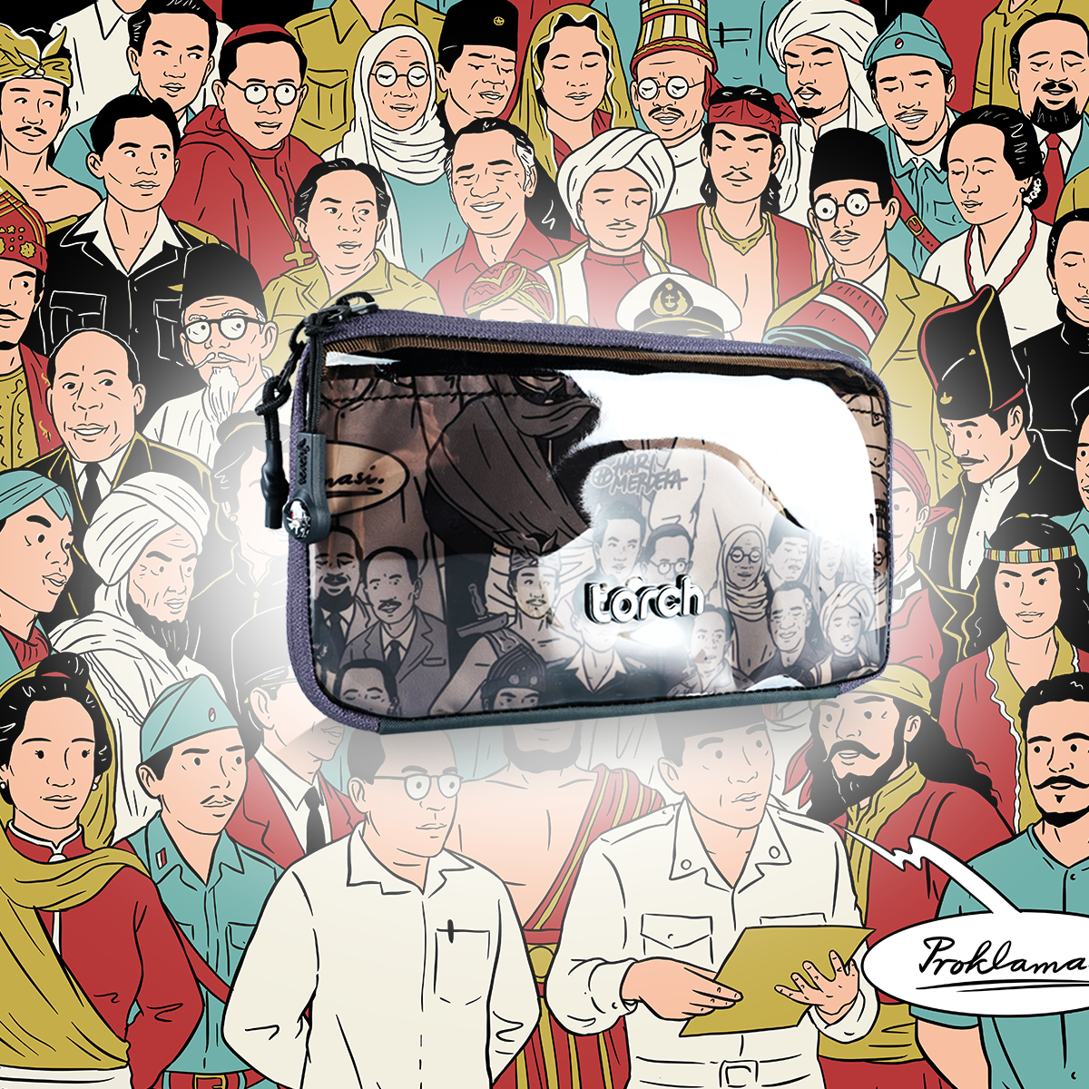 Bagian depan dari koleksi ini memiliki pattern spesial hasil karya dari @harimerdeka yang menggambarkan karakter tokoh-tokoh pejuang dan pahlawan bangsa Indonesia.