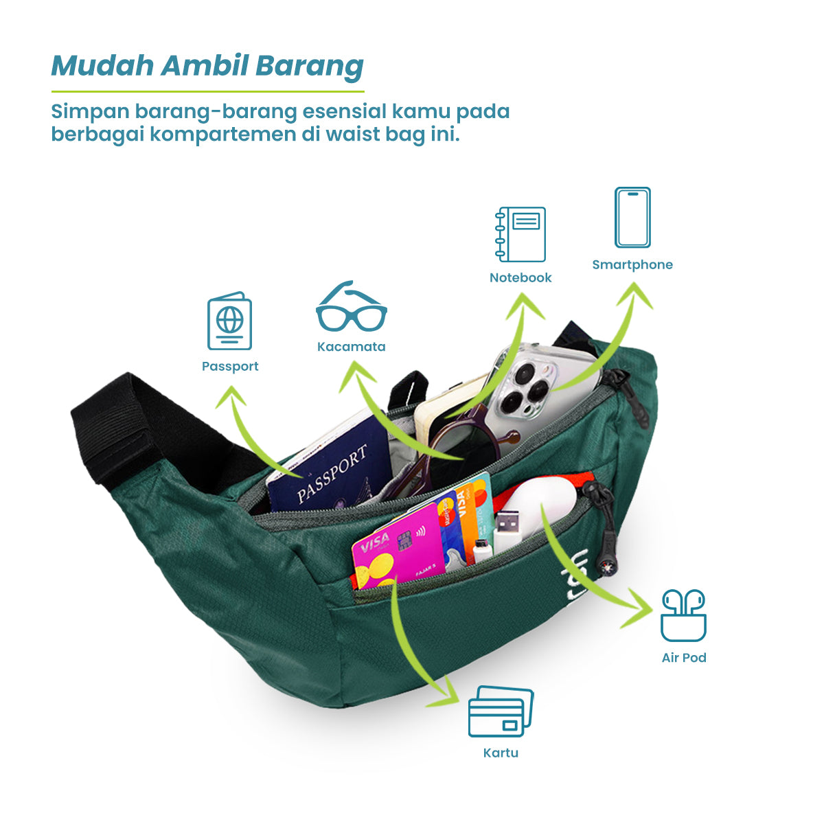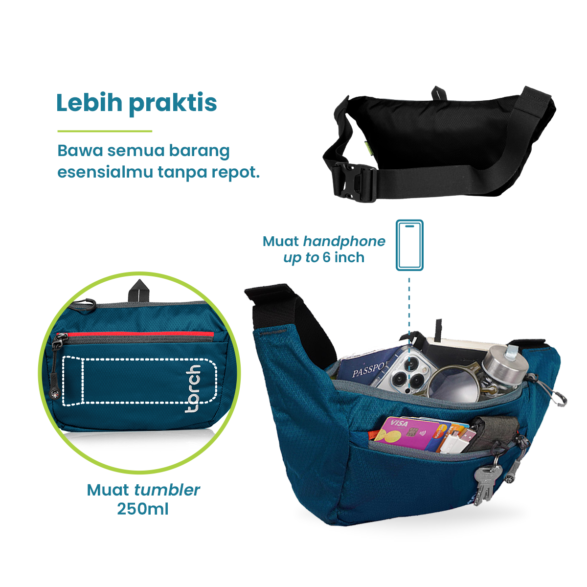 Tas pinggang selempang ringan anti air. Dengan muatan banyak, dan saku depan yang luas.