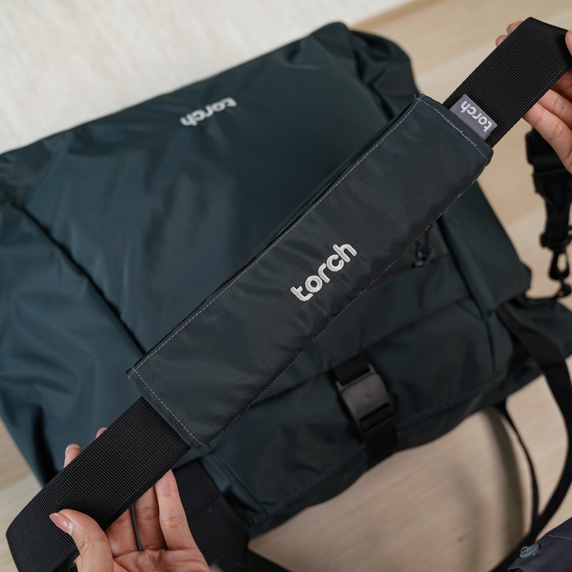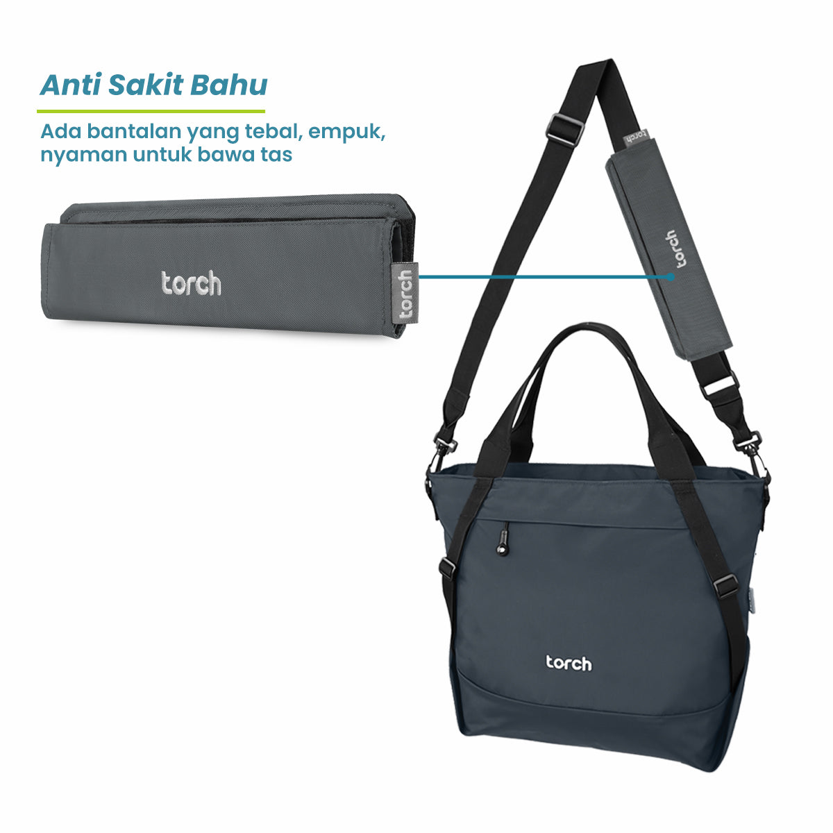 Tinggal buka velcro pada bagian belakang shoulder pad, terus kaitkan ke strap sling bag atau messenger bag kamu. Udah deh, langsung bisa dipakai biar bahumu gak nyeri.
