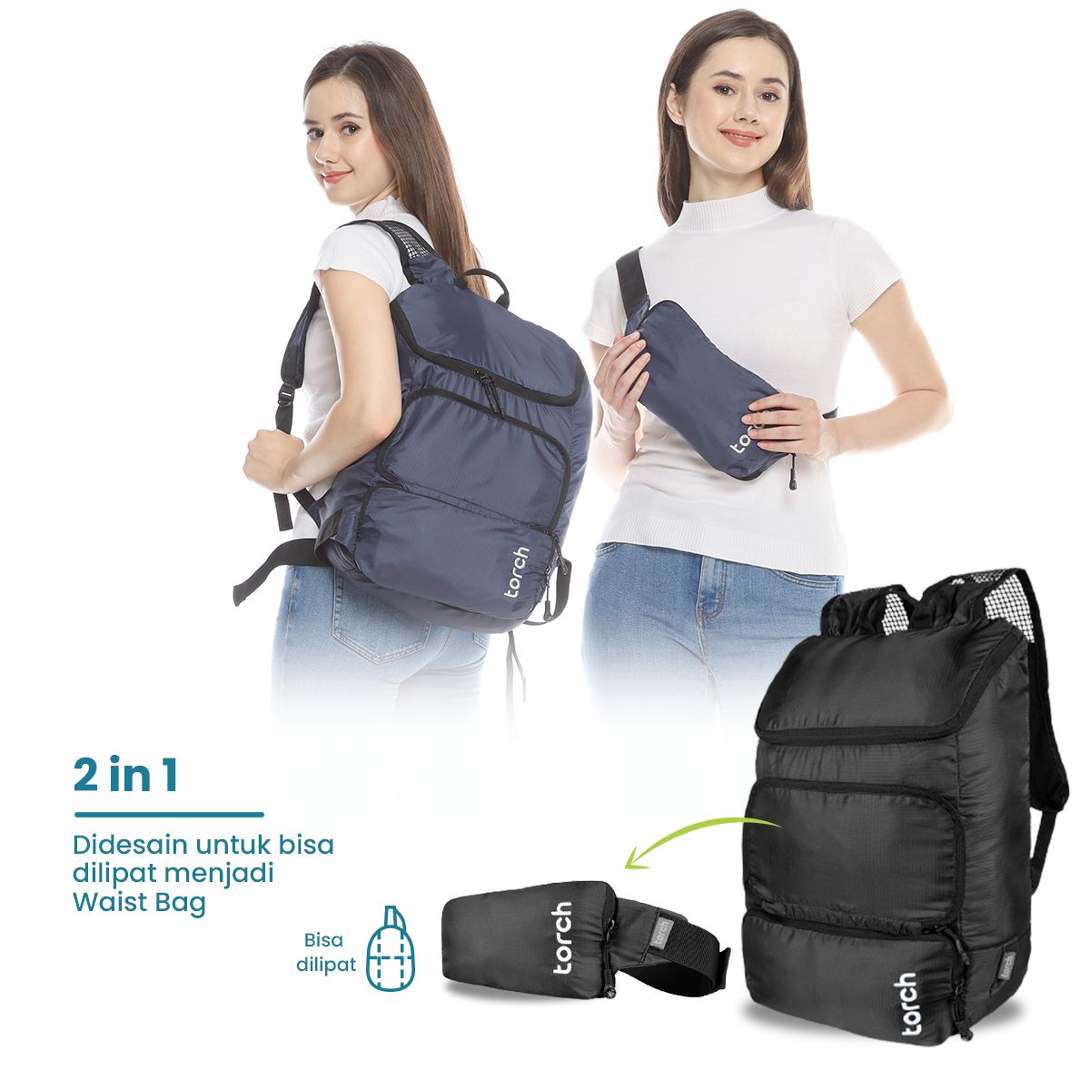 Kamu yang butuh bawa tas tambahan ketika jalan-jalan bisa dengan praktis bawa 1 tas ini. Rampak foldable bag ini bisa dimanfaatkan sebagai backpack dan saat terlipat bisa dimanfaatkan sebagai waist bag.