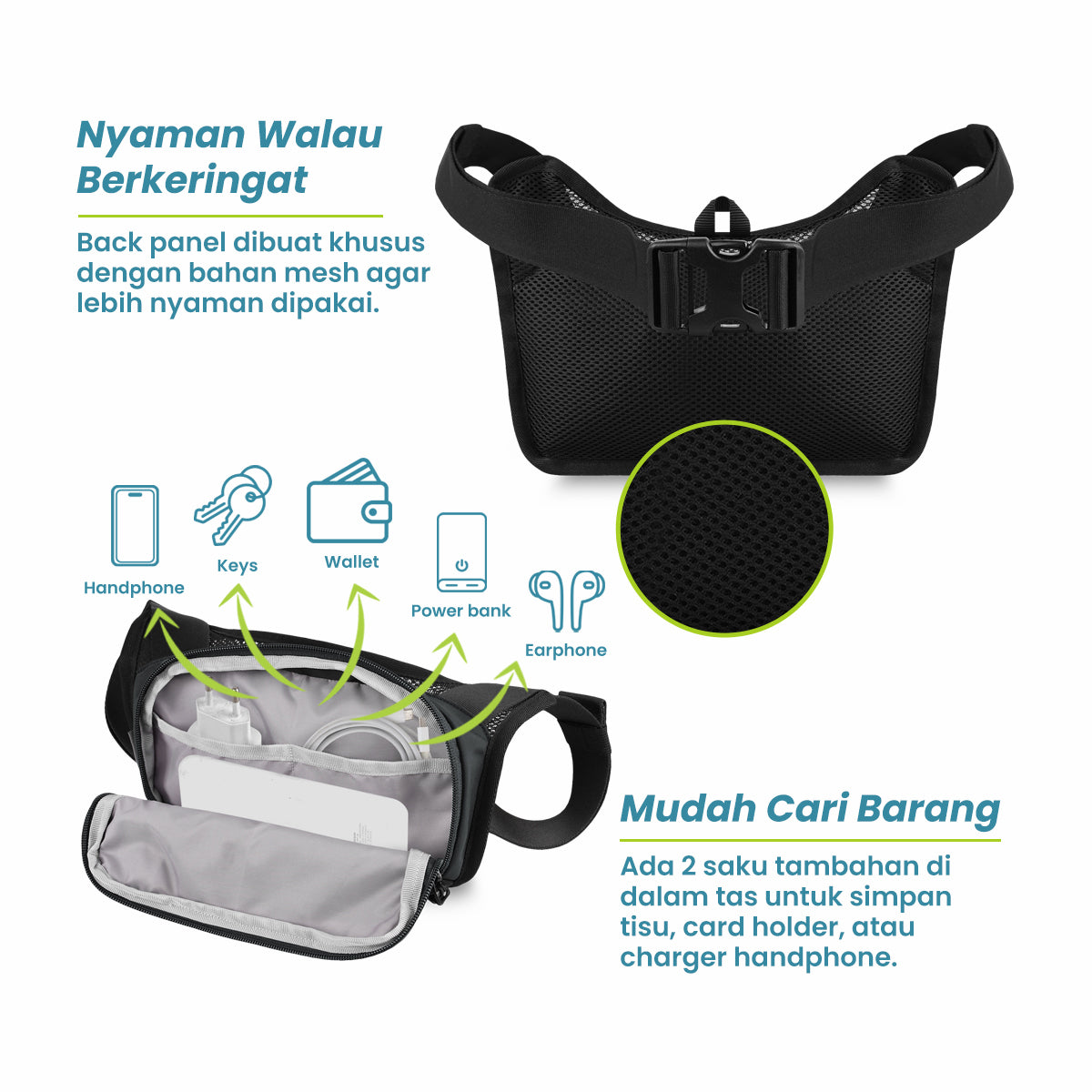 Ran Sling Bag ini spesial karena punya pocket khusus yang bisa muat botol minum sampai kapasitas 800 mL, loh! Jadi nggak perlu ribet bawa botol di tangan pas lari atau jogging pulang kantor. Bahan di bagian belakangnya dilengkapi sama material breathable yang gak bikin gerah atau panas walau dipake seharian.