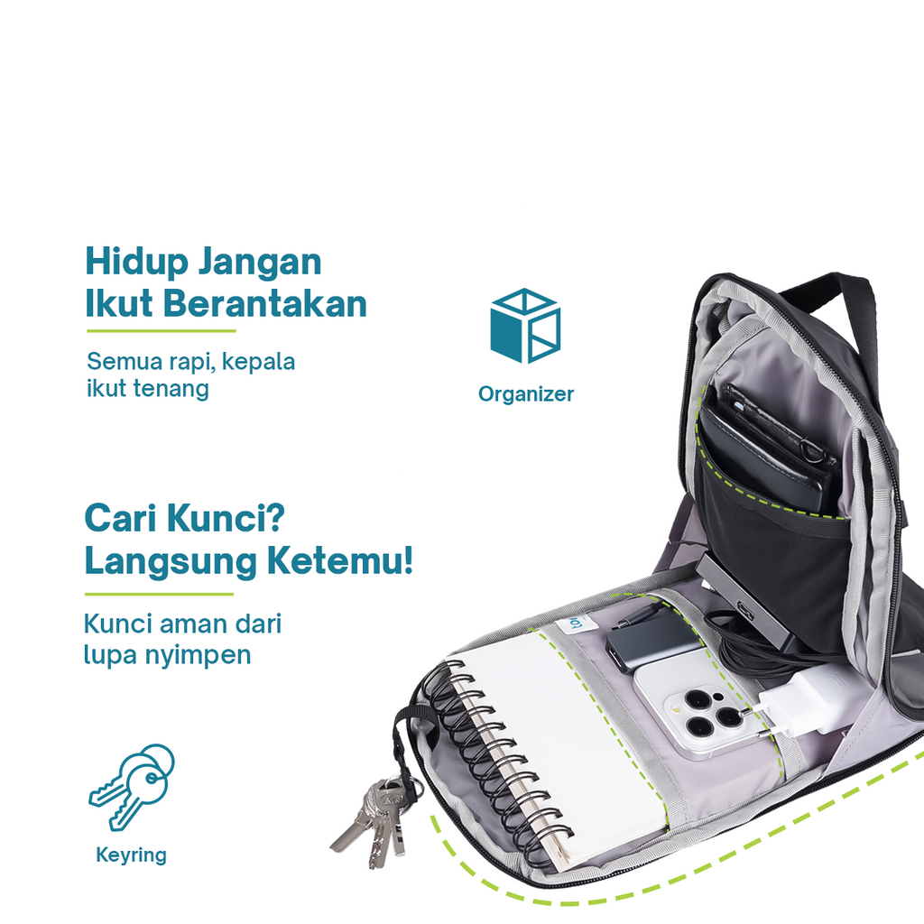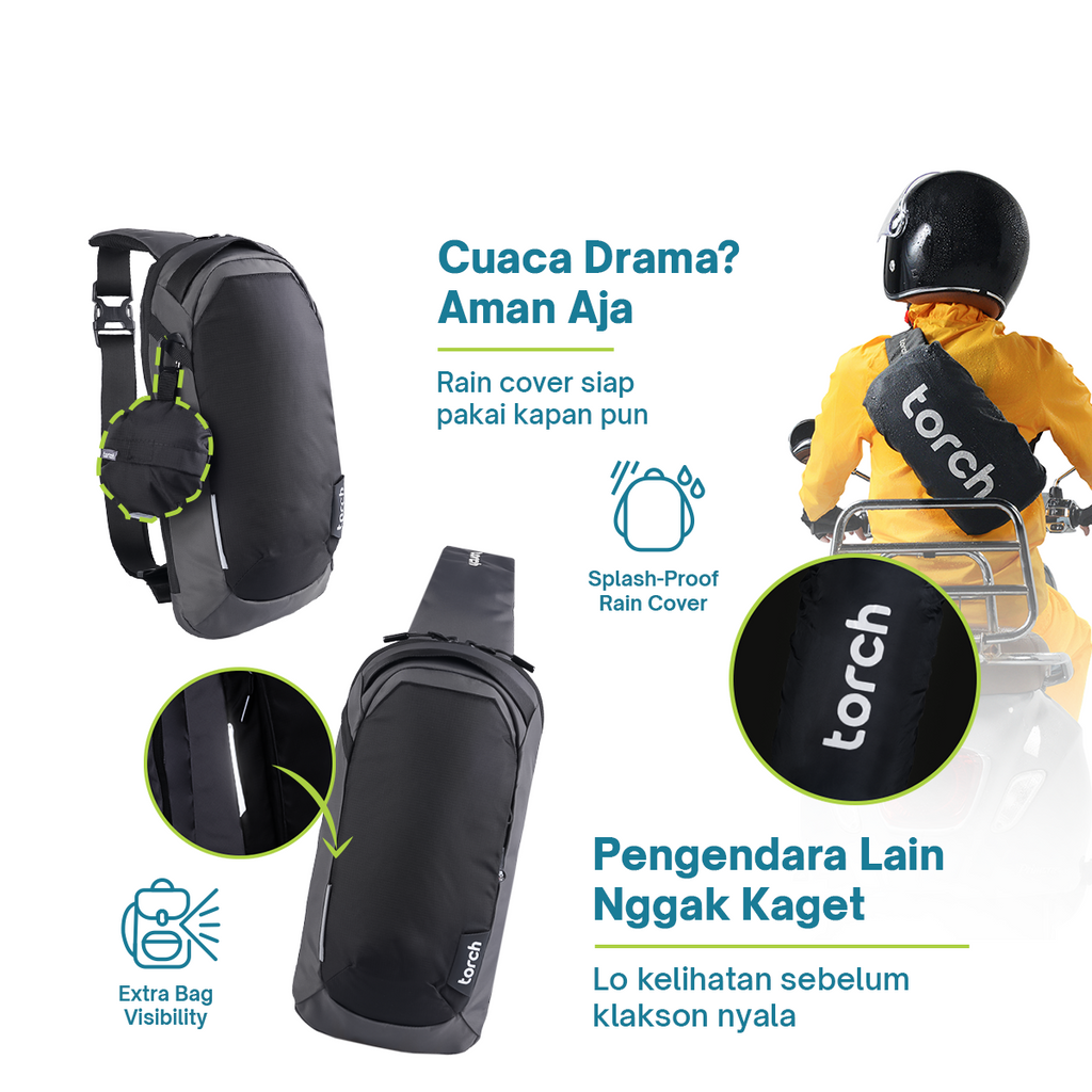 Crossbody bag yang dirancang khusus buat lu yang tiap pagi ngebut ke kantor pake motor, tapi tetep pengen tampil rapih, siap, dan nggak ribet.