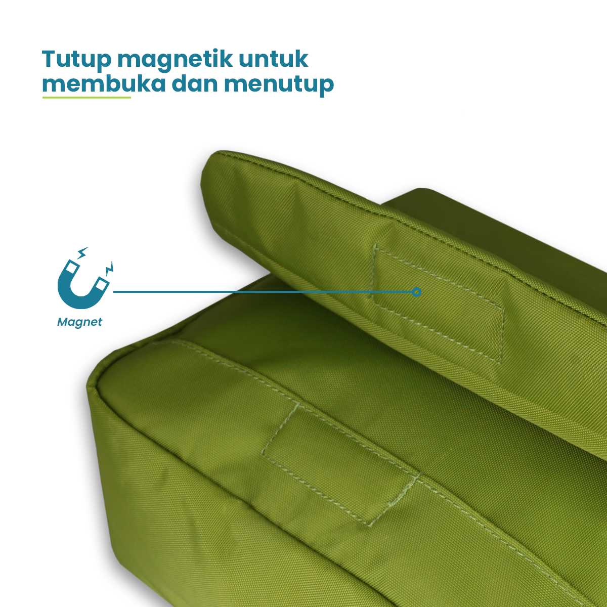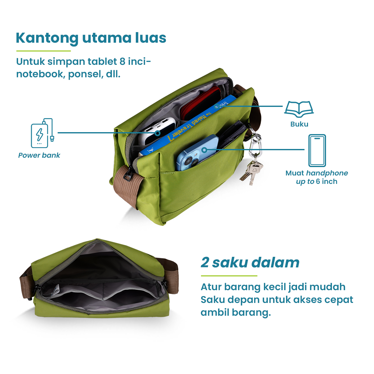 - Muat tablet 8inch. Saku kecil yang menempel di kompartemen laptop bersifat elastis untuk menyimpan powerbank dan benda kecil lainnya.