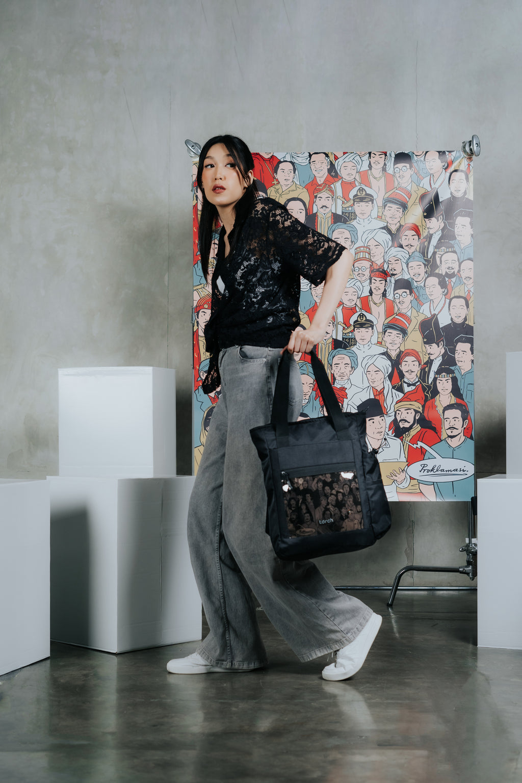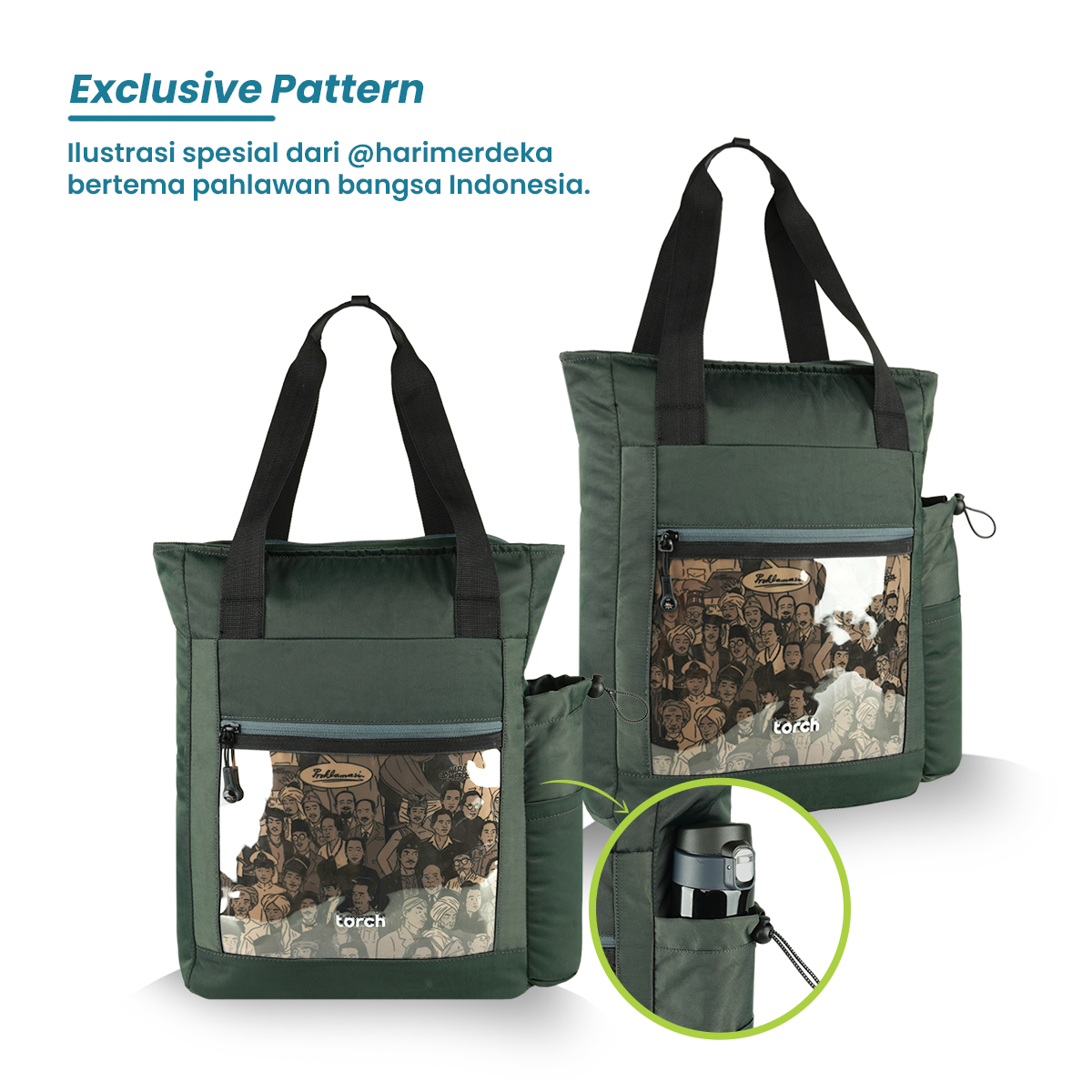 Terdapat hasil karya ilustrator asal indonesia yaitu @harimerdeka, tas yang satu ini punya pattern spesial yaitu, terdapat 44 ilustrasi tokoh pendiri dan pahlawan bangsa indonesia yang dikemas dengan lebih trendi dan warna yang eye catching.