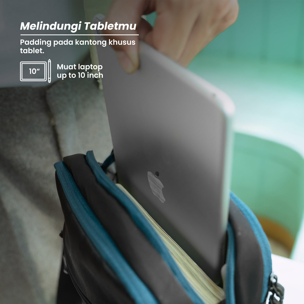 Tas ini didesain khusus dengan banyak ruang untuk menyimpan tablet dan juga barang-barang lainnya. Mulai dari kompartemen khusus laptop, saku-saku kecil di dalam kompartemen depan, saku depan dan saku belakang.