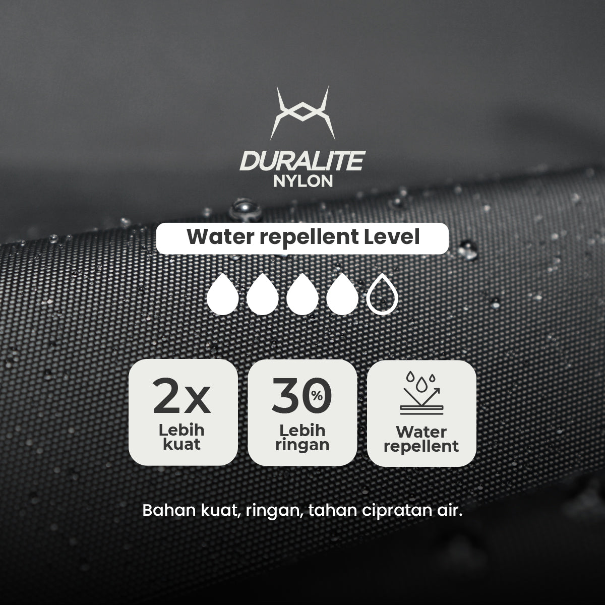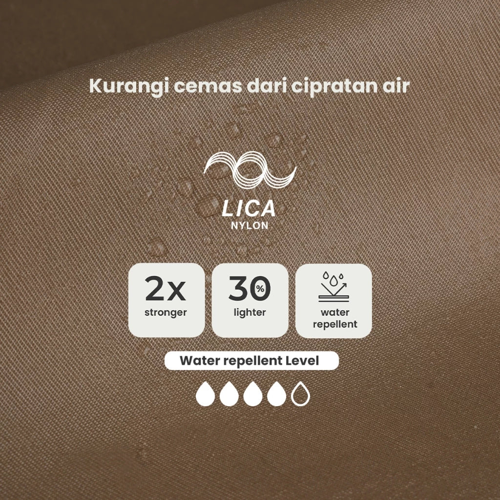 Material tasnya terbuat dari Lica Nylon yang water repellent. Sehingga lebih aman saat terkena cipratan air.