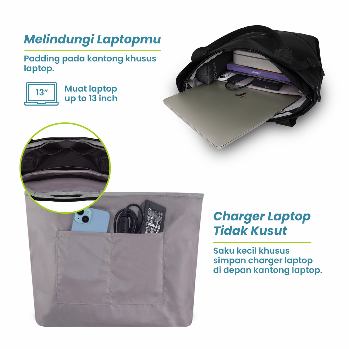 Pulang dinas kantor ada rencana workout? Gak perlu khawatir laptop kamu ketekan barang lain! Soalnya, ada kantong tebal khusus laptop yang muat sampai 13 inch. Di depannya juga ada kantong kecil lagi yang bisa kamu pake untuk simpan handphone, charger, atau gadget lainnya.
