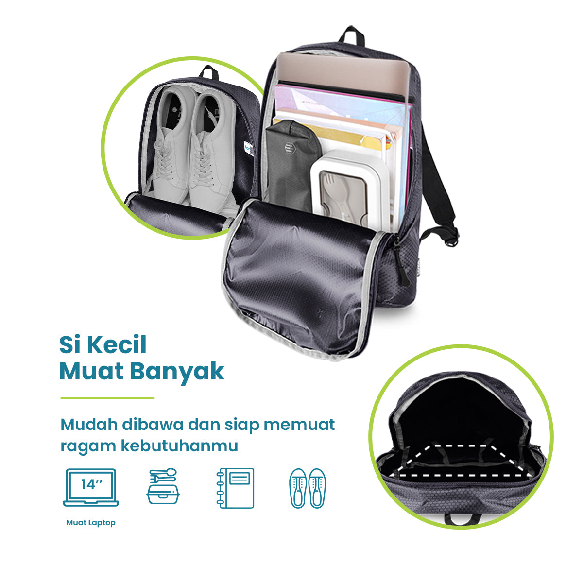 Kamu bisa memasukkan buku, tempat makan dan alat tulis. Walaupun tidak terdapat tempat untuk laptop, tapi laptop 13 inch atau 14 inch yang slim bisa masuk. Disarankan pakai laptop sleeve ya.