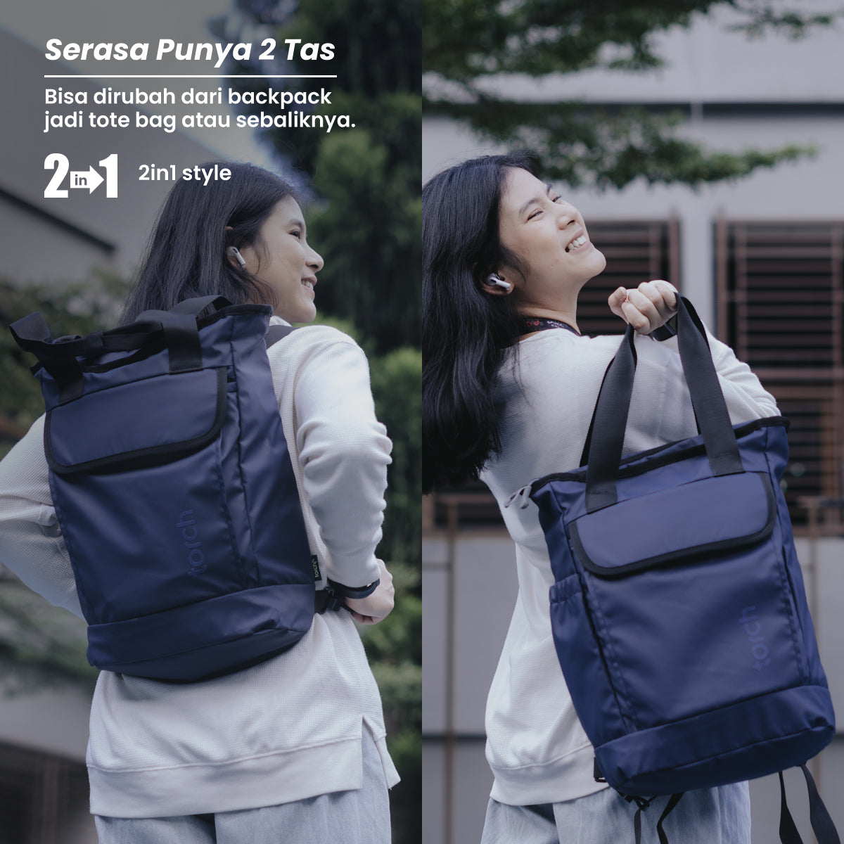 Backpack yang bisa dipakai dengan cara dijinjing (jadi tote bag) atau digendong (jadi backpack). Desainnya stylish cocok dipakai ke kantor, kampus, sekolah, atau traveling.