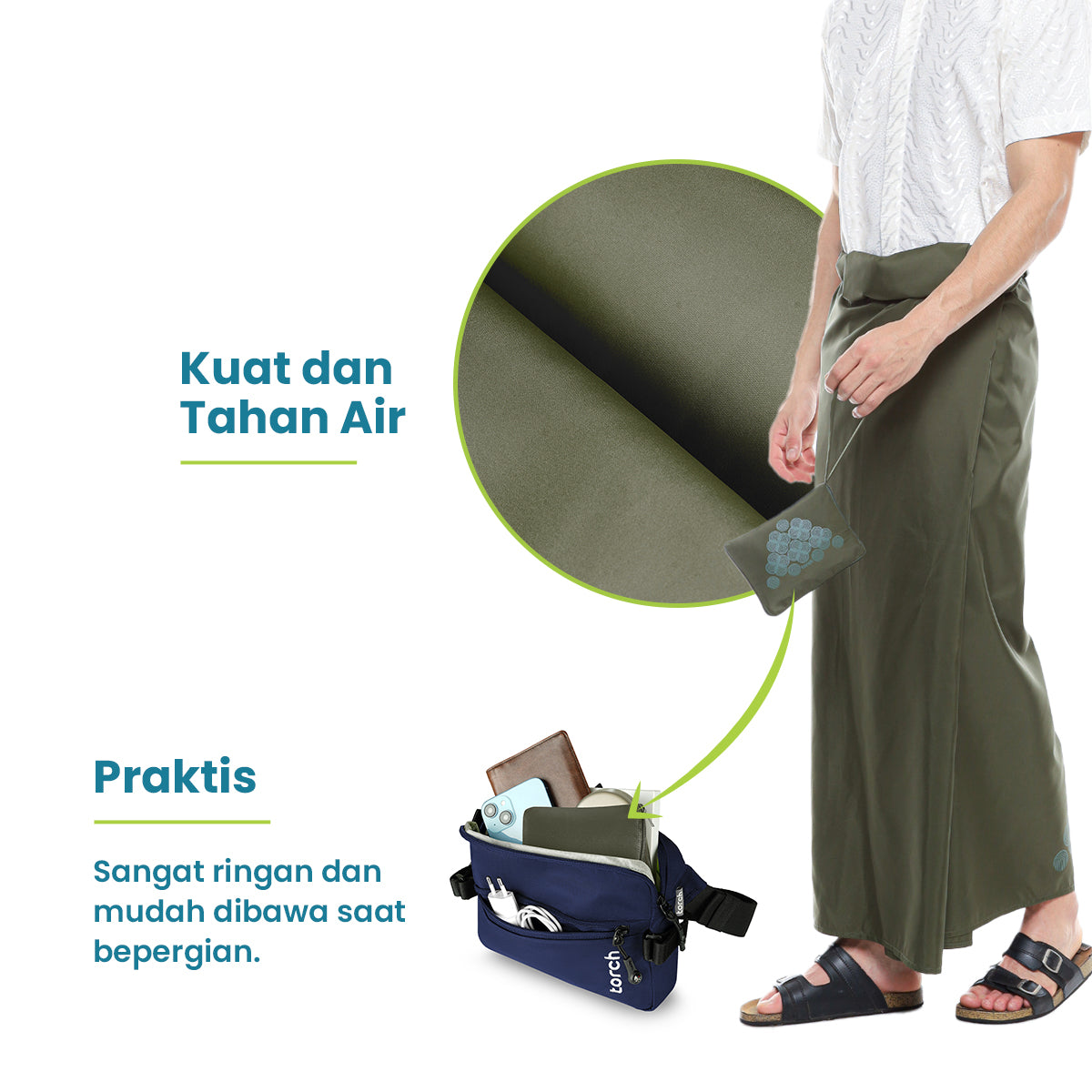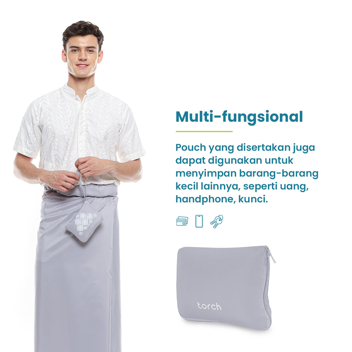 Sarung yang satu ini bisa kamu bawa dengan mudah, karena bisa dilipat ke dalam pouchnya hingga seukuran hp mu. Tambah lagi masih ada saku kecil untuk simpan sajadah lipat dari Torch.
